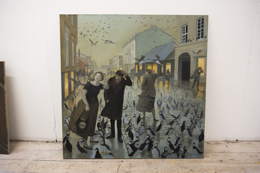 DV birtir þessar myndir frá sýningu Þrándar Þórarinssonar. Hann málar í klassískum stíl, teflir saman nýjum og gömlum tíma, en skellir inn í myndirnar sínar ögrandi hugmyndum sem fá mann til að sjá hlutina í óvæntu samhengi.