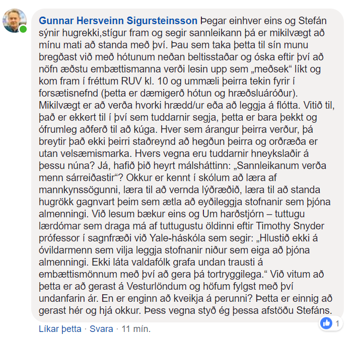 Margir starfsmenn taka undir þessi skrif og Gunnar Hersveinn skrifar eftirfarandi færslu sem hér birtist skjáskot af. Segir hann að hinir ásökuðu muni bregðast við með hótunum neðan beltisstaðar. Sakar hann borgarfulltrúana um hræðsluáróður. „Ekki láta valdafólk grafa undan trausti á embættismönnum með því að gera þá tortryggilega,“ segir Gunnar.