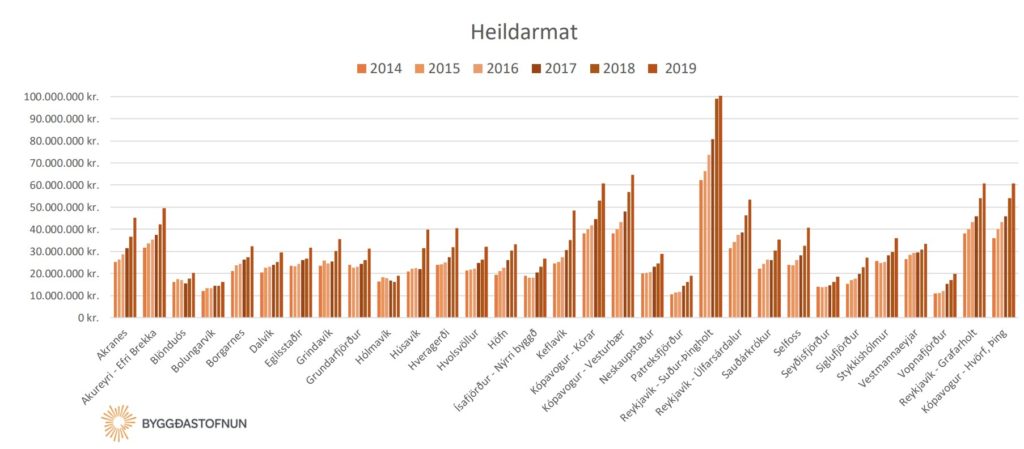 Heildarmat hækkaði mest á Húsavík á milli áranna 2017 – 2018 eða um 43%, úr 22 m.kr. í rúmar 31 m.kr. Nú hækkar það um 27,1% og fer í 39,9 m.kr. Í ár hækkar matið mest í Keflavík, eða um 37,7% og er nú 48,5 m.kr. næst á eftir Akureyri. Lægsta heildarmatið er í Bolungarvík 16,1 m.kr. sem er 2,3 m.kr. lægra en á Seyðisfirði og 2,9 m.kr. lægra en á Patreksfirði. Í Bolungarvík hækkaði matið um 11,3% á milli ára.