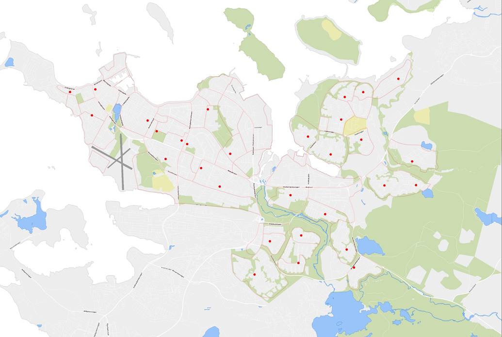 Uppdrátturinn sýnir hvar hleðslubúnaður verður settur upp við 30 starfsstöðvar borgarinnar. Íbúar munu hafa áhrif hvar allt að 60 að auki verða í borgarlandinu.