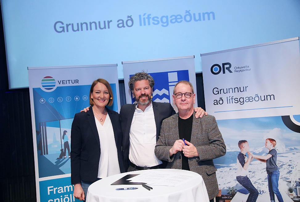 Það voru þau Dagur B. Eggertsson borgarstjóri, Bjarni Bjarnason forstjóri OR og Inga Dóra Hrólfsdóttir, framkvæmdastjóri Veitna, sem undirrituðu samkomulagið á ársfundi OR í Hörpu nú síðdegis.