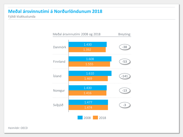 Árið 2008 var meðal ársvinnutími á Íslandi 1.486 stundir og um 120 stundum lengri en að meðaltali annars staðar á Norðurlöndunum. Milli áranna 2008 og 2018 styttist ársvinnutíminn á Íslandi um 140 stundir en mun minna í hinum löndunum. Árið 2018 var meðal ársvinnutími á Íslandi svipaður og að meðaltali á Norðurlöndunum, 50-80 stundum lengri en í Noregi og Danmörku en svipaður og í Svíþjóð en tæpum 90 stundum styttri en í Finnlandi.