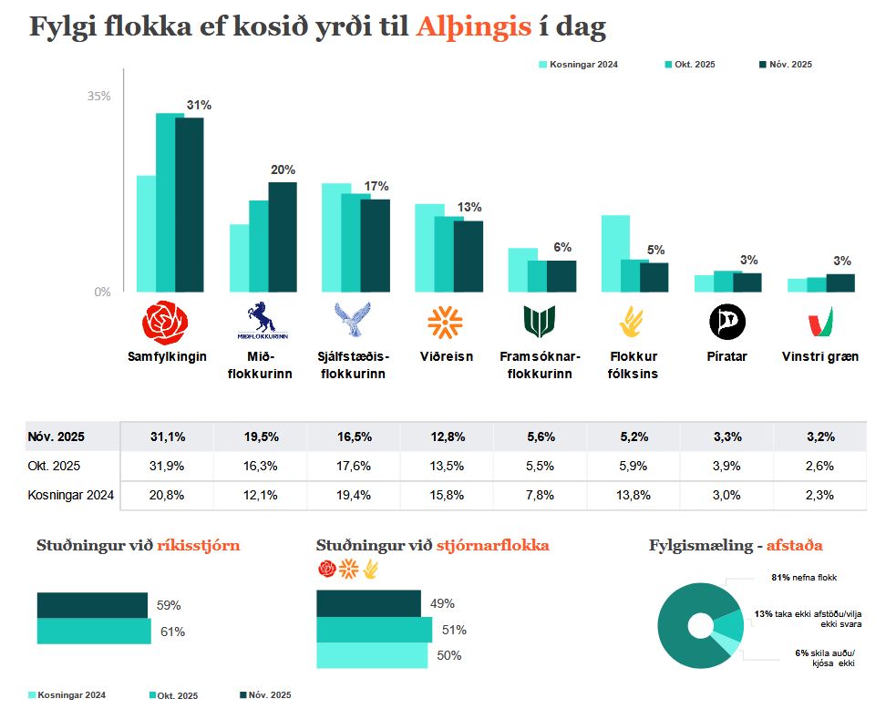 Liðlega 31% kysi Samfylkinguna, tæplega 17% Sjálfstæðisflokkinn, nær 13% Viðreisn, tæplega 6% Framsóknarflokkinn, rúmlega 5% Flokk fólksins, ríflega 3% Pírata og Vinstri græn og rúmlega 2% Sósíalistaflokk Íslands. Slétt 6% myndu skila auðu eða ekki kjósa og næstum 13% taka ekki afstöðu eða vilja ekki gefa hana upp.