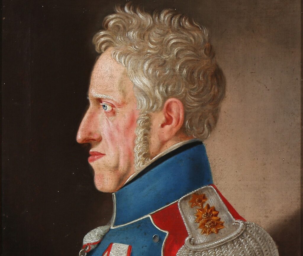 Einvaldskonungurinn Friðrik VI í túlkun málarans Christoffer Wilhelm Eckersberg. Snemma árs 1835 spurðist út að konungur hygðist skerða prentfrelsi enn frekar. Í kjölfarið sendu 572 málsmetandi borgarar konungi bænaskjal sem hann svaraði með þeim orðum að „enginn nema vér einir“ værum þess umkomnir að meta hvað væri þjóðfélaginu raunverulega til farsældar.