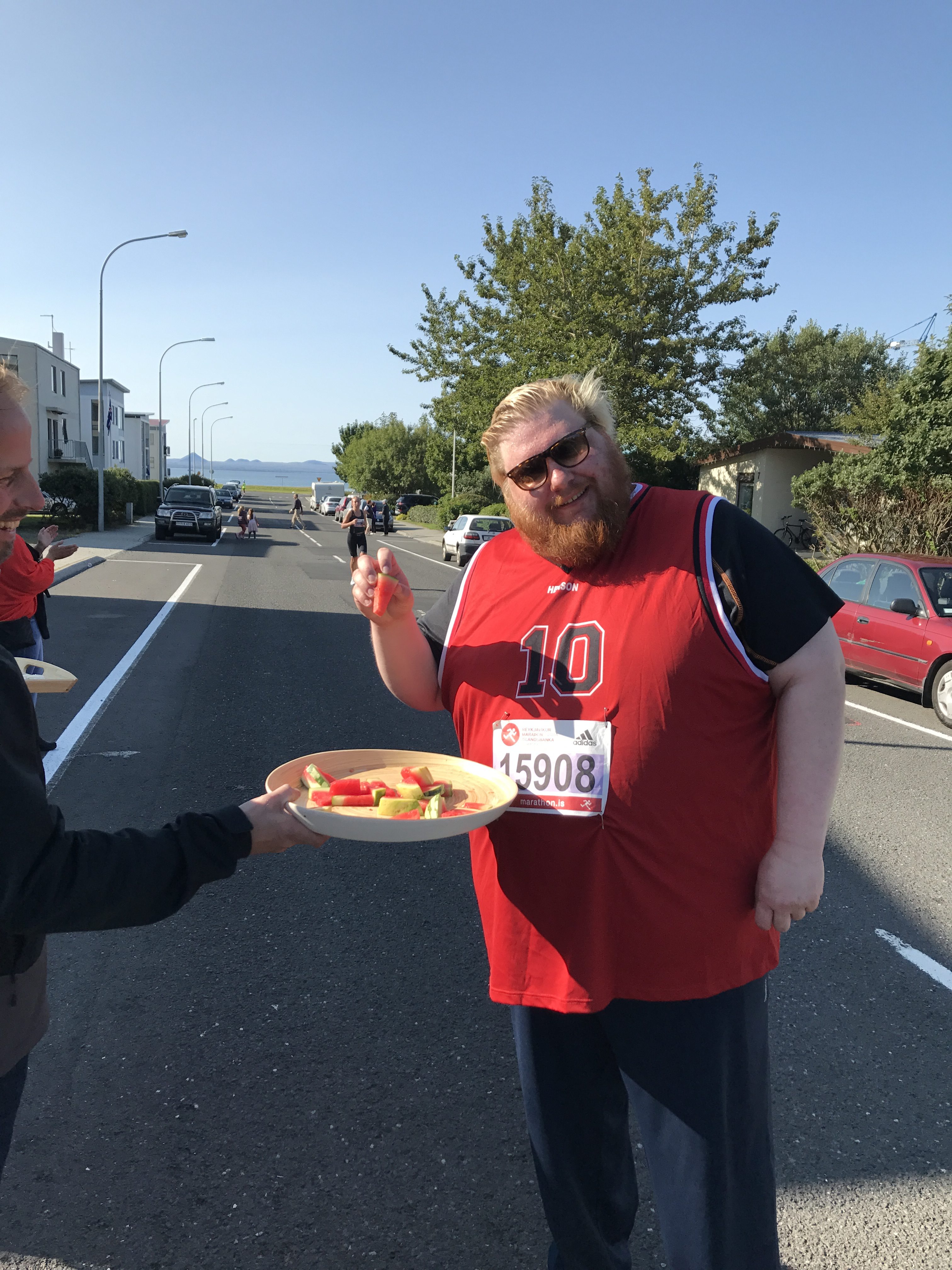 Hlaðborðið svignar undan kræsingum; bakaðar eru bollakökur og þær skreyttar í tilefni dagsins, boðið er upp á ferska ávexti, osta, hráskinkur, pylsur, pönnukökur, brauð og pestó, kornflexgotterí og margt, margt fleira, svo fátt sé nefnt. Bollakökurnar eru allra vinsælastar hjá hlaupurunum, en í þetta skiptið voru bökuð um 300 stykki. Melónurnar eru afar vinsælar og sérstaklega vinsæll munnbiti hjá þyrstum maraþonhlaupurunum. Umfram allt er boðið upp á ískalt Prosecco, vatn, ávaxtasafa eða léttan bjór.