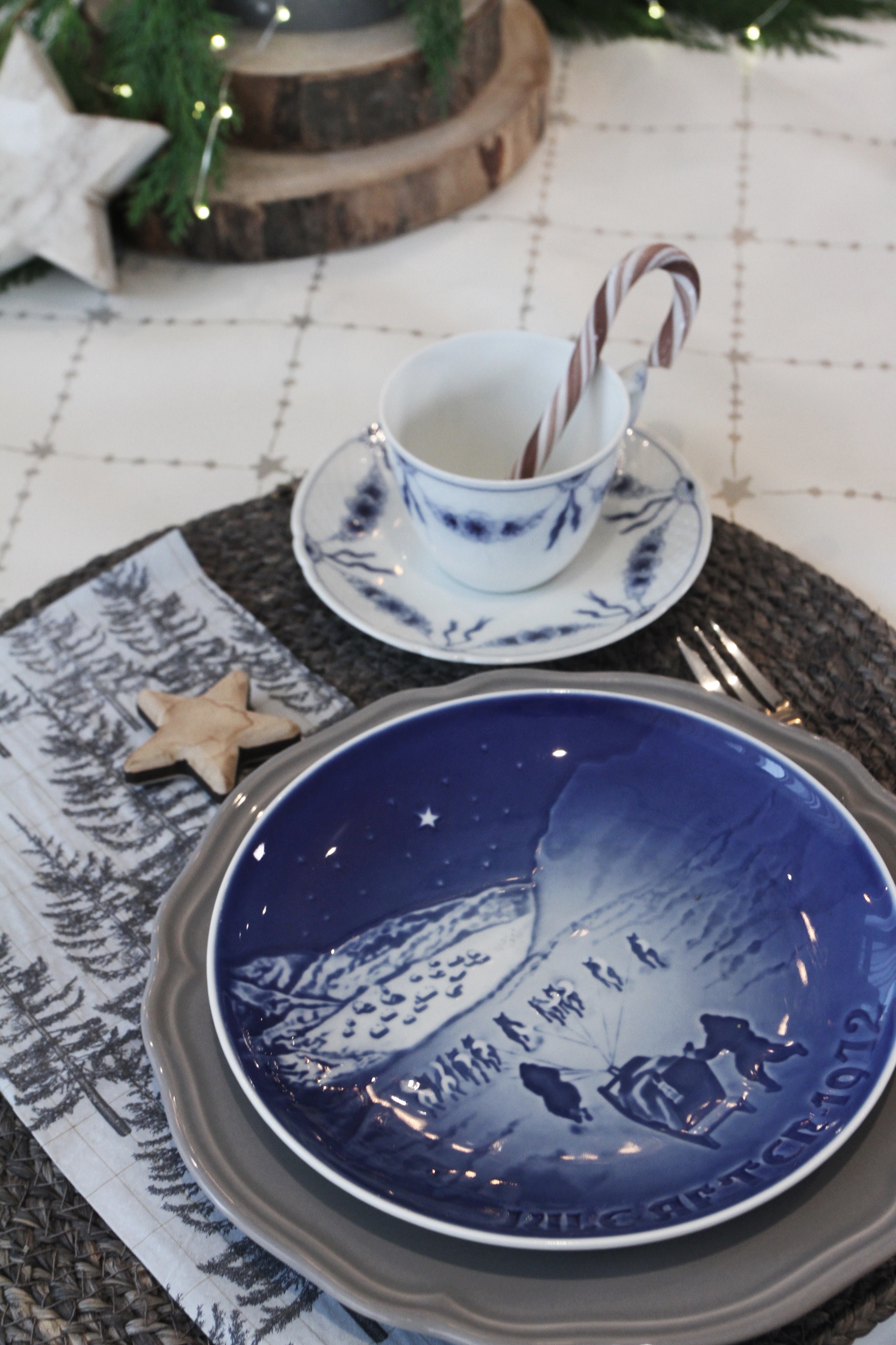 „Ég notaði gömlu góðu jóladiskana sem ég held að margir geti fundið inni í skáp hjá mömmu og pabba, eða ömmu eða bara frænku, og mér finnst svo gaman að nota þá sem kökudiska eða sem forréttadiska á jólum. Með setti ég síðan Bing & Gröndahl kaffistellið. Með réttu ættu þetta að vera kakóbollar en við lítum fram hjá því í þetta sinn. Til þess að skreyta borðið notaði ég síðan greinar af Thuju frá Blómavali og trén fallegu koma líka þaðan. Í stað þess að vera með kökudisk á fæti, þá setti ég bara viðarplatta, líka frá Blómavali, til þess að setja kökuna á og til þess að hækka annað tréð.“