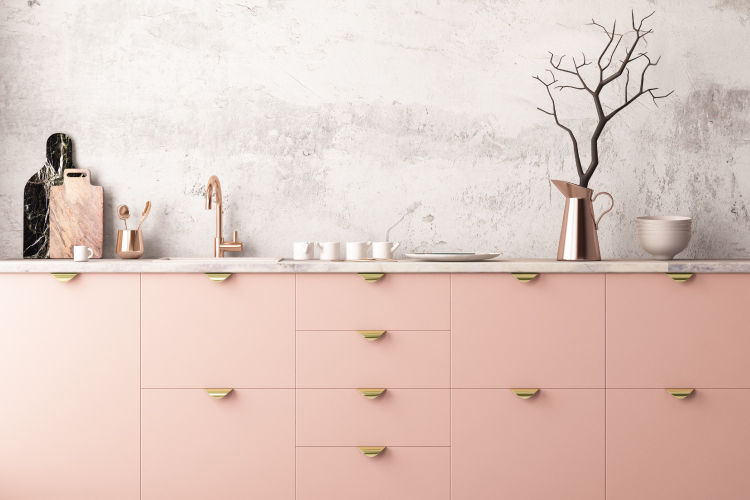 Ef fólki hugnast ekki að kaupa nýja eldhúsinnréttingu til að tolla í tískunni er til dæmis hægt að láta filma gömlu hurðarnar með pastel litum og svo er bara að skipta um höldur. Gylltar höldur fara sérstaklega vel við pasteltónana eins og sjá má í myndasafninu og það sama má segja um pottaplöntur því hraustlegi græni liturinn smellpassar við flesta pastelliti.