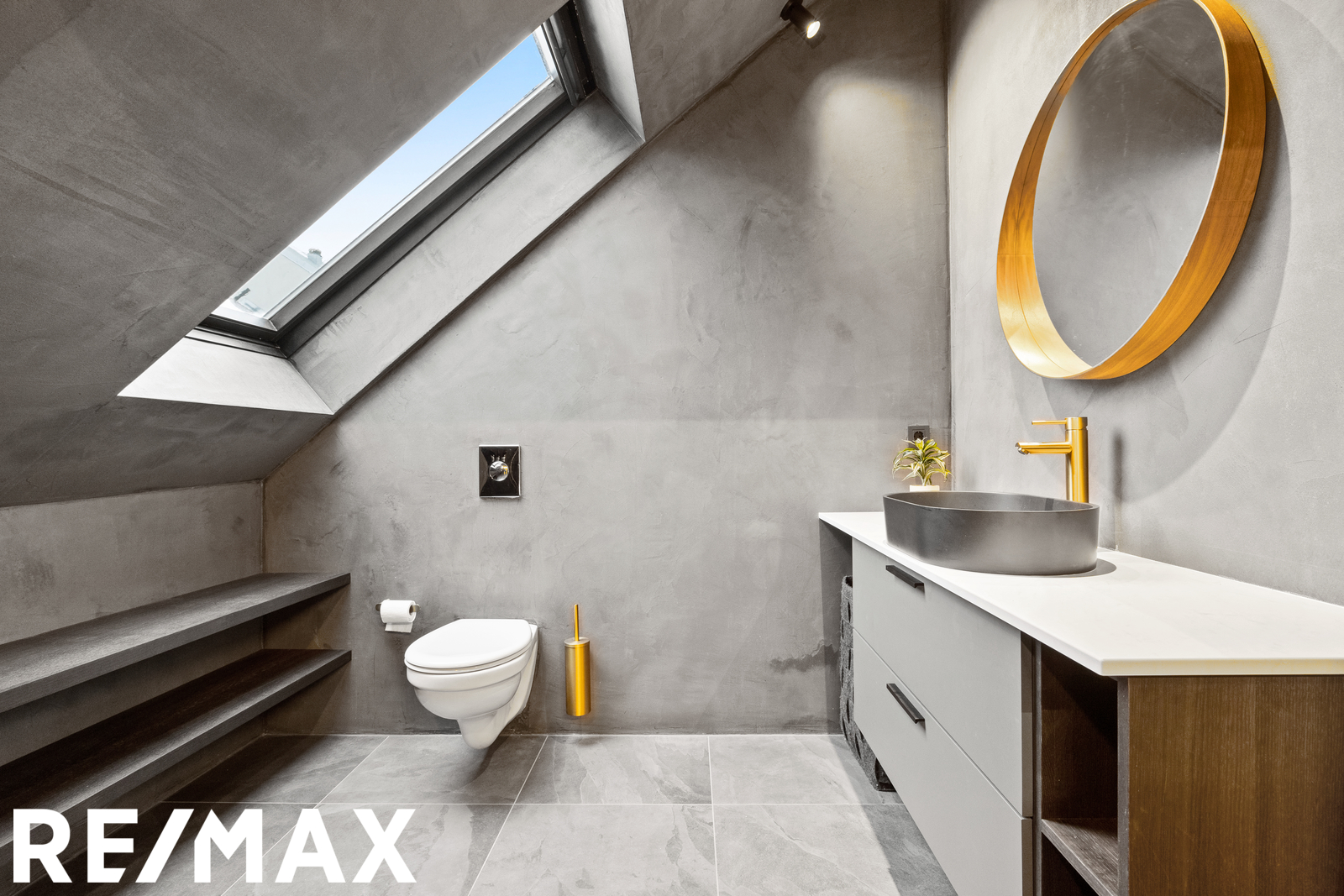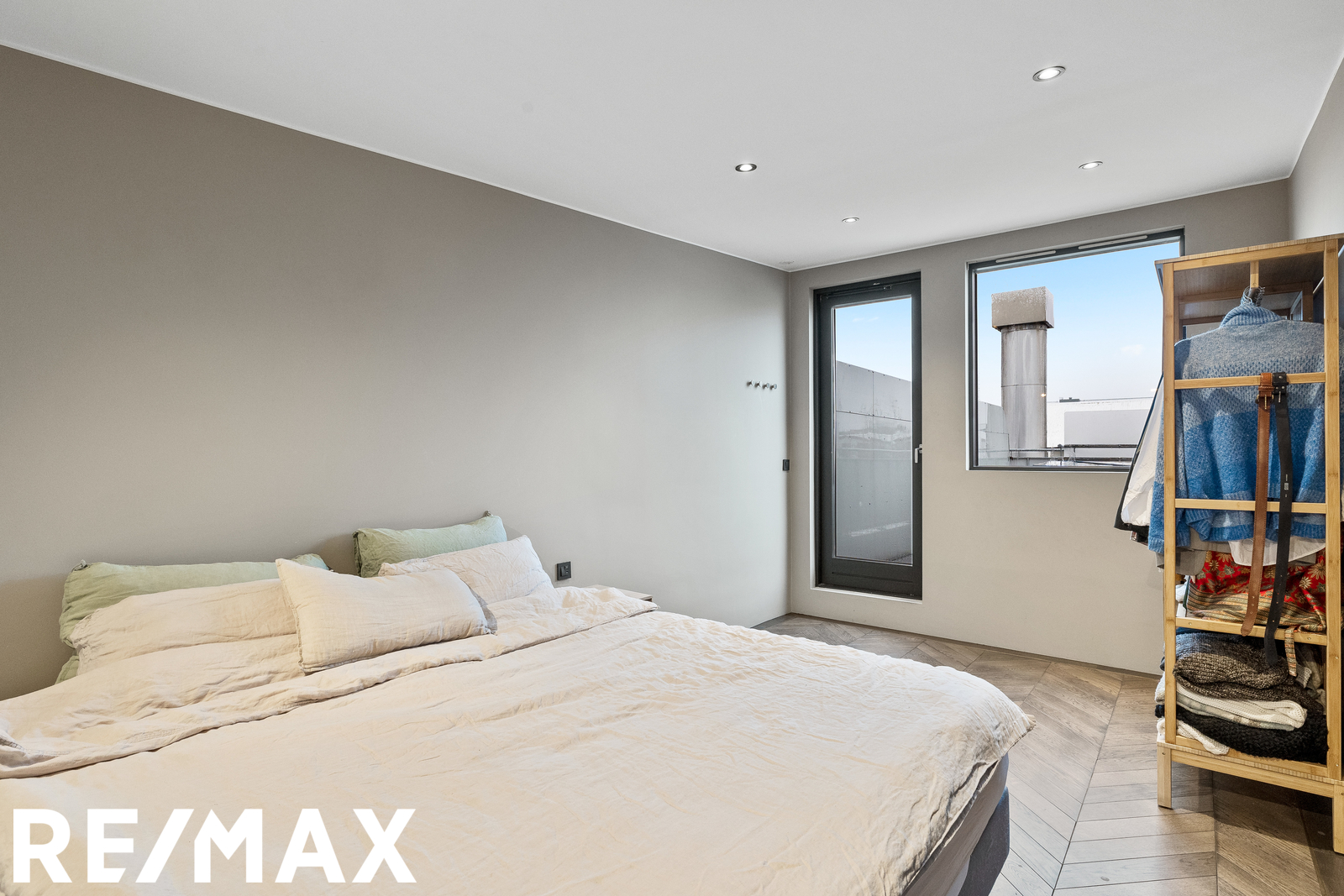 Á efri hæðinni er rúmgott svefnherbergi með parket á gólfi og fataskáp. Þaðan er útgengt á svalir með heitum potti og útsýni yfir miðbæinn.