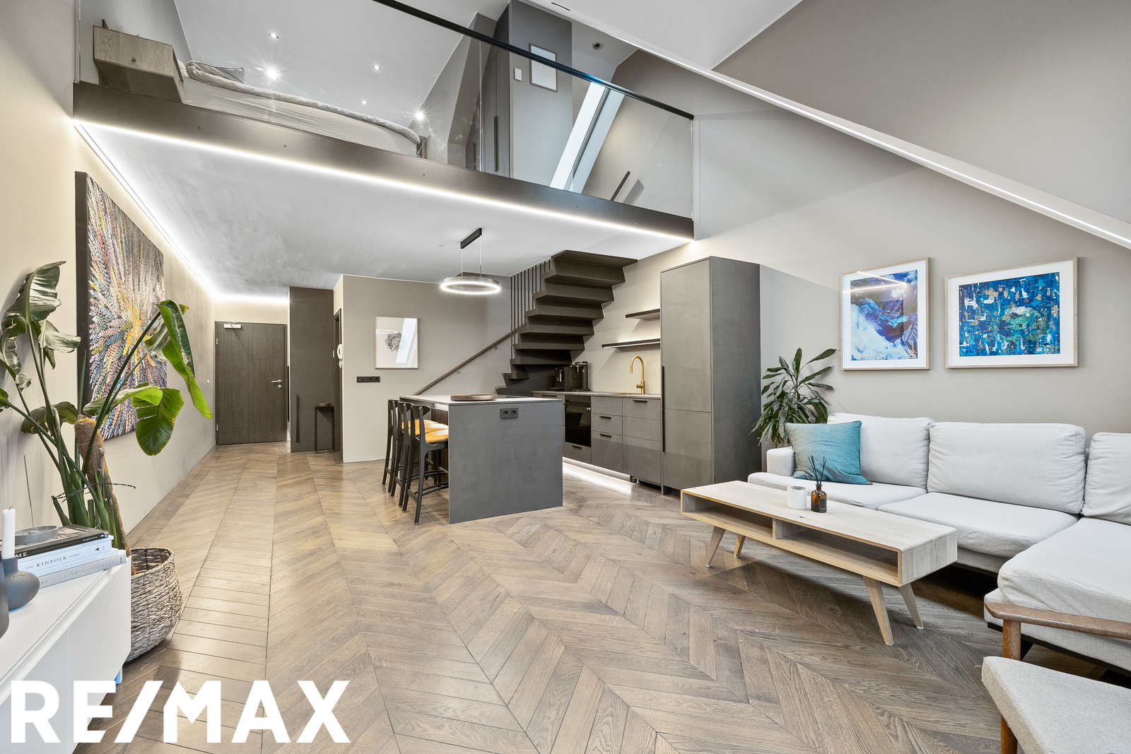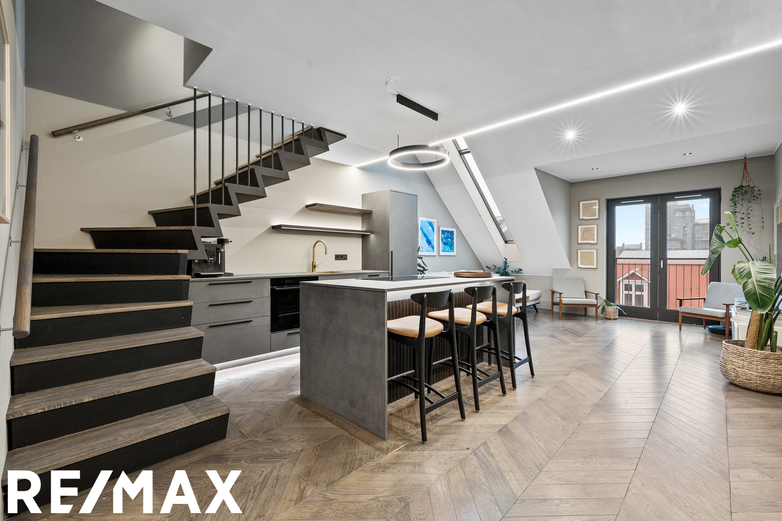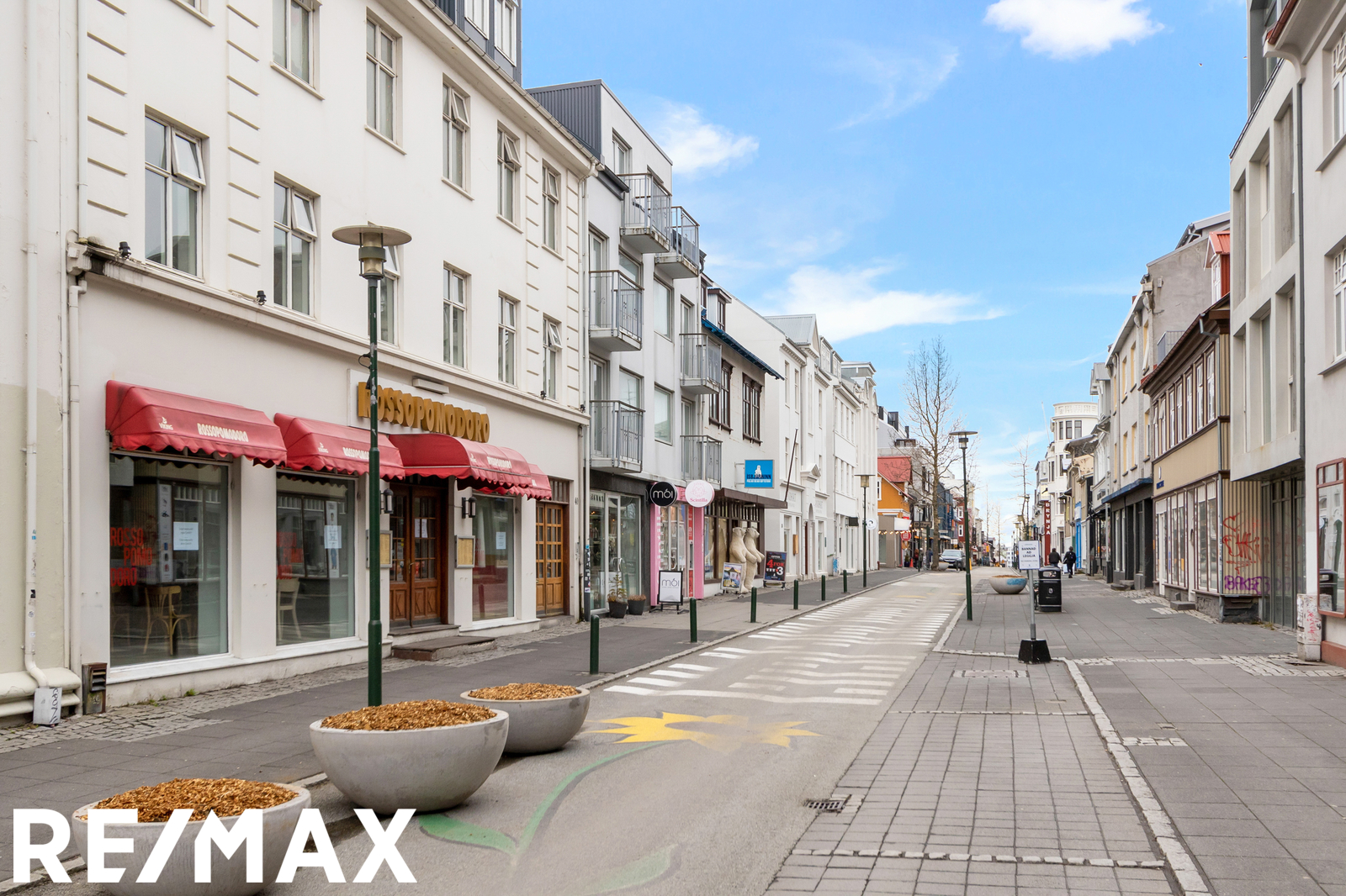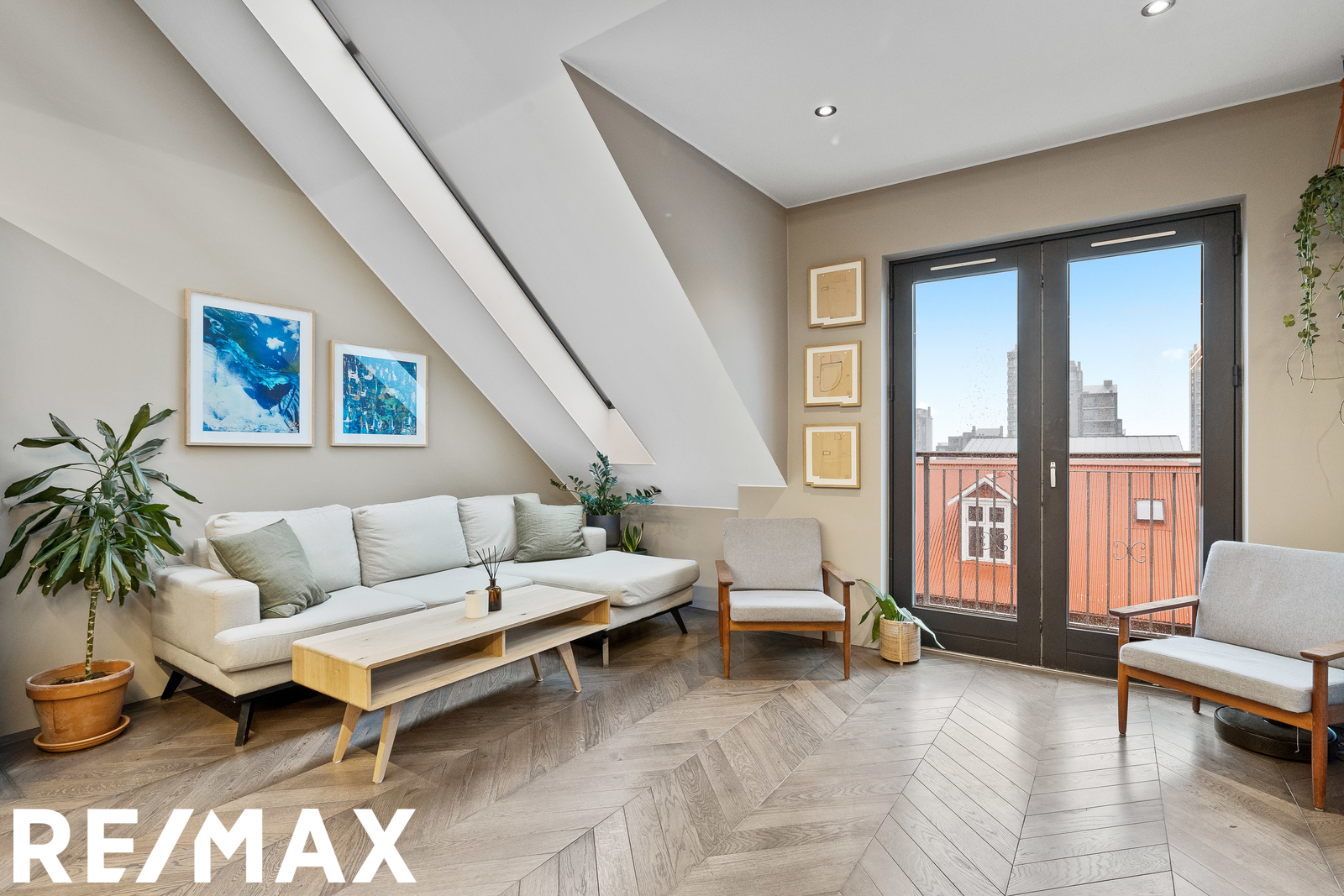 Eldhús, stofa og borðstofa er í björtu og rúmgóðu rými með aukinni lofthæð að hluta. Á gólfum er Chevron eikarparket og útgengt er á svalir sem snúa út á Laugaveg,