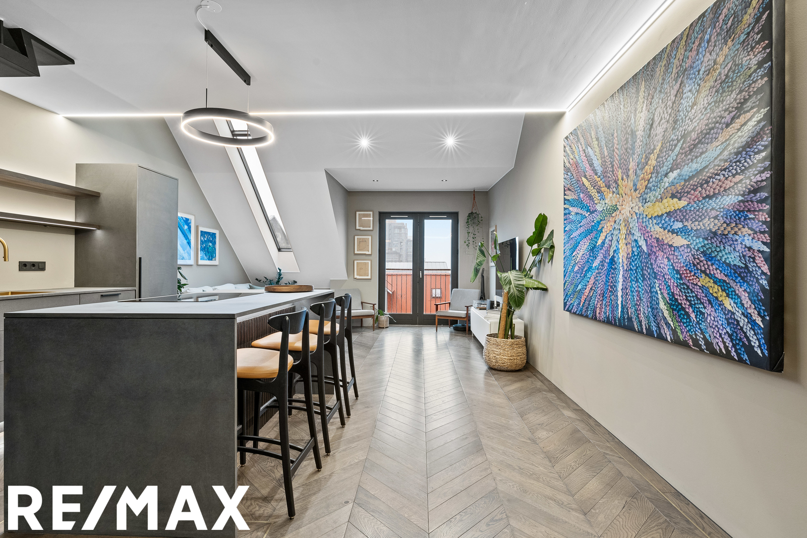 Í eldhúsi er dökkgrá innrétting með eyju, sérsmíðuðum hillum úr reyktri eik og innfelldri dimmanlegri lýsingu við sökkul. Gyllt blöndunartæki og vaskur frá Lusso, innbyggður ísskápur og uppþvottavél og 80 cm spanhelluborð í eyju. Dimmanlegt LED hringljós yfir eyju. Tveir tenglar á hlið eyju og þráðlaus símahleðsla í borðplötu. Á baðherbergi eru fallegar flísar frá Parka á gólfi og hluta veggja.