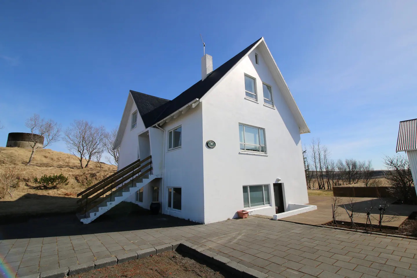 Húsið er með níu svefnherbergi og svefnpláss fyrir 20 manns, sundlaug, einkagarð og fleira. Tilvalið fyrir ættarmót, brúðkaup og fleiri slíka fögnuði eins og segir í lýsingu, og gestgjafinn segist geta reddað kokki til að sjá um veisluna. Húsið var byggt árið 1962 sem bóndabýli, en var nýlega tekið í gegn þó haldið sé í gamla sjarmann. Hestar og kindur ganga um landareignina og fiskistangir fylgja með í gistiverðinu enda vatn nálægt sem hægt er að veiða í.