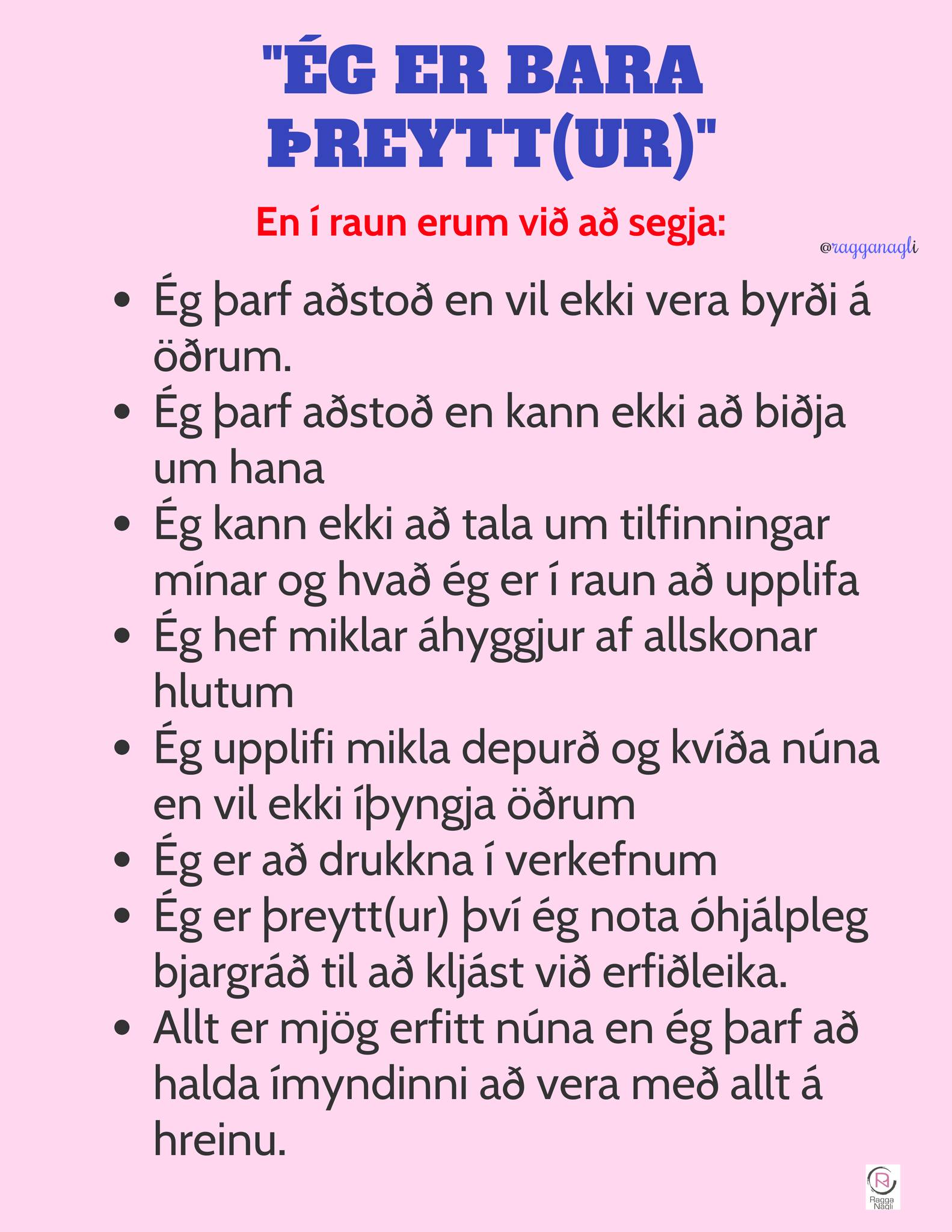 Pistlar Ragnhildur Þórðardóttir sálfræðings, betur þekkt sem Ragga nagli, sem skrifaðir eru á mannamáli njóta mikilla vinsælda á Facebook-síðu hennar. Í þeim nýjasta fjallar Ragga um þá tilhneigingu margra okkar að svara aðspurð að við höfum það bara fínt og allt sé í góðu lagi þrátt fyrir að líða illa og vera alveg að missa marga, ef ekki alla boltana sem við reynum að halda á lofti.
