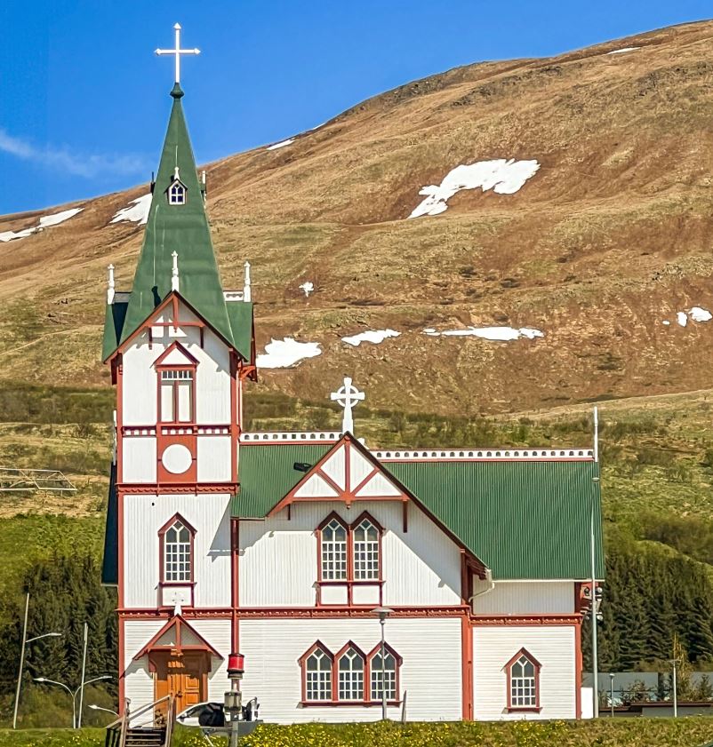 Hvít kirkja með grænu þaki sem er ein af þeim þekktari á landinu. Húsavíkurkirkja var vígð árið 1907 en ekki máluð fyrr en árið 1924. Húsavíkurkirkja er krosskirkja úr norskum við sem var friðuð árið 1982.