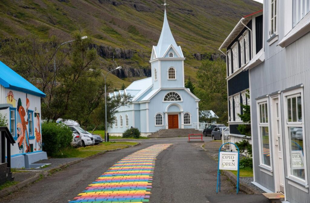 Hin ákaflega sérstaka bláa og hvíta kirkja á Seyðisfirði er ein af þekktari byggingum Íslands. Hún var byggð á árunum 1920 til 1922, að hluta til upp úr eldri kirkju. Árið 1989 skemmdist kirkjan í eldsvoða þegar verið var að lagfæra hana. Þykir kirkjan bera sterk einkenni Austurlands og norskrar timburhúsagerðar.