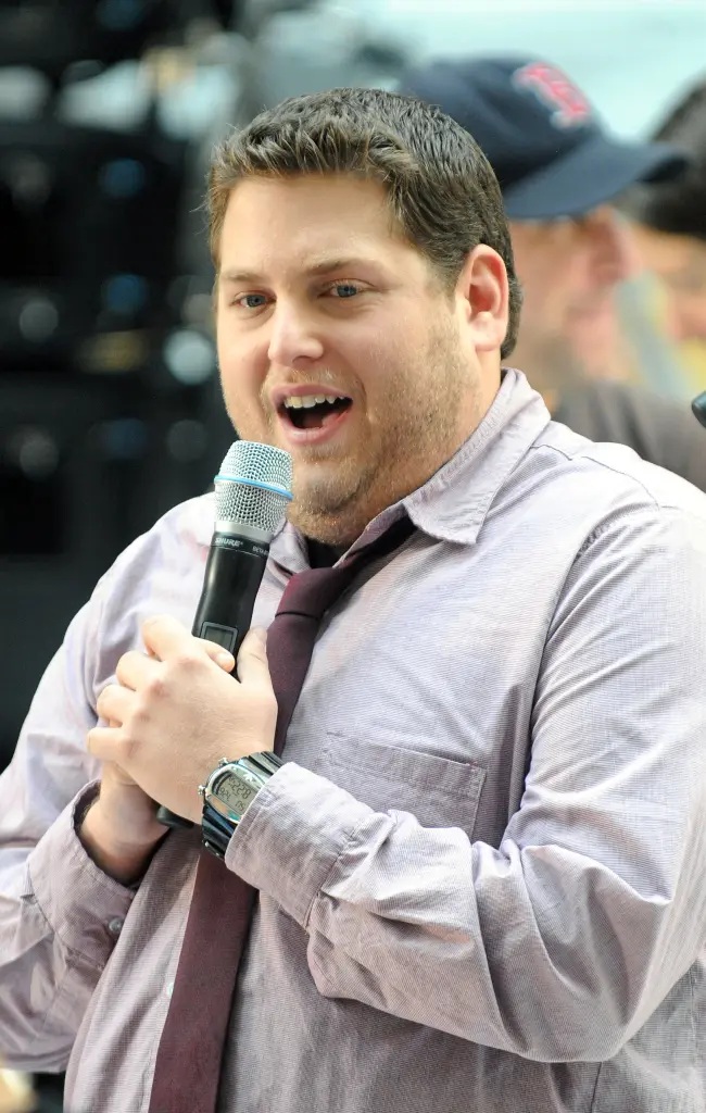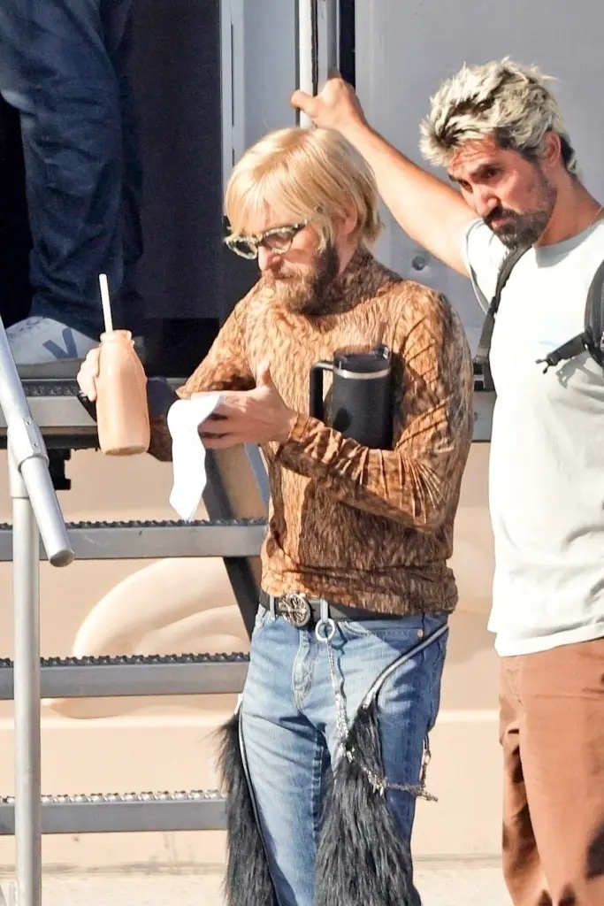 Hill, sem var myndaður ásamt meðleikaranum Kristen Wiig, hefur lagt verulega af. Auk þess var hann í gervi frá áttunda áratugnum með loðna ljóshærða hárkollu og þykk gleraugu.
