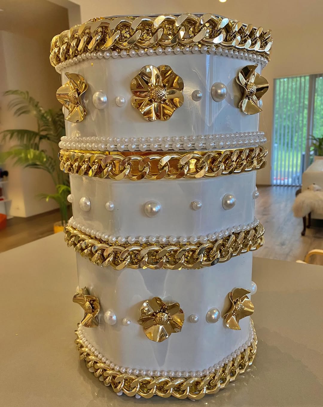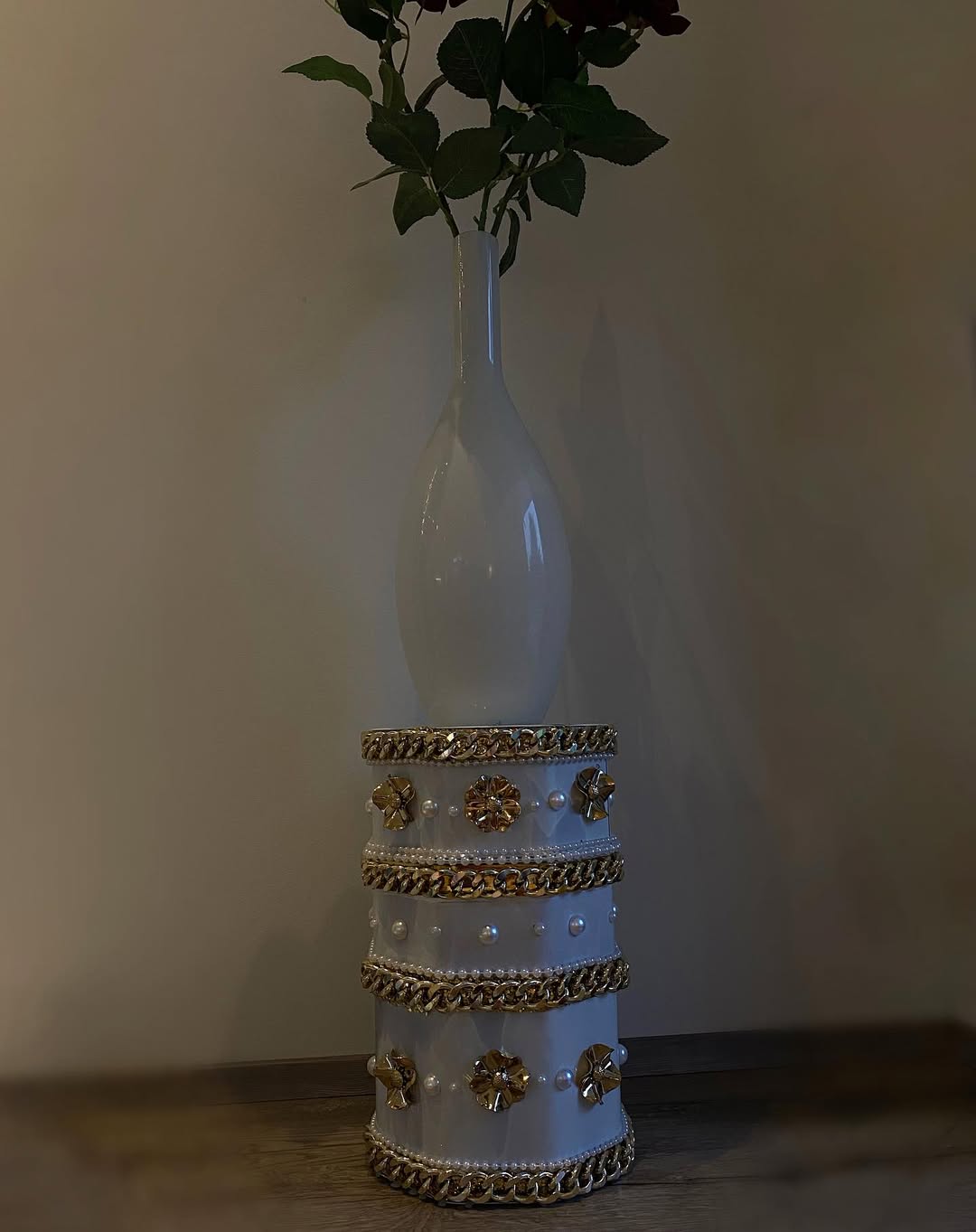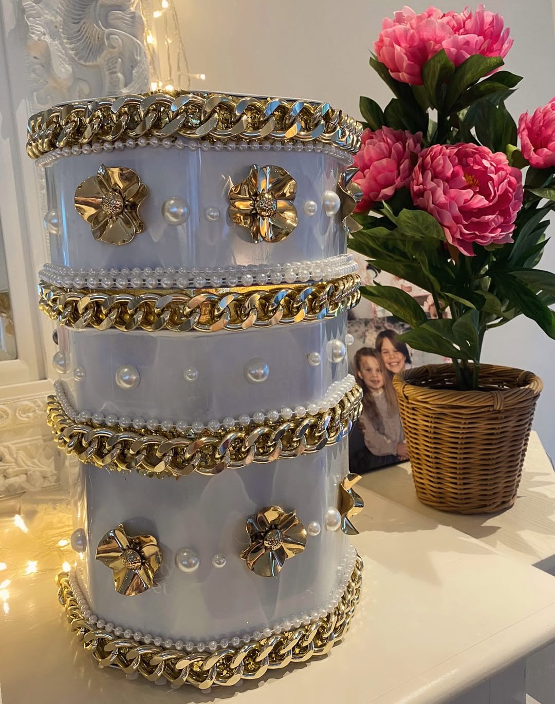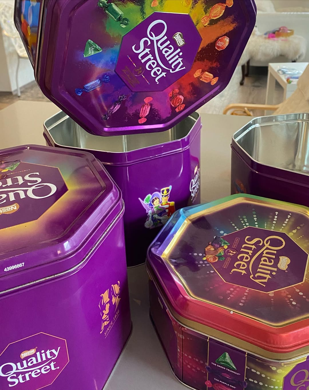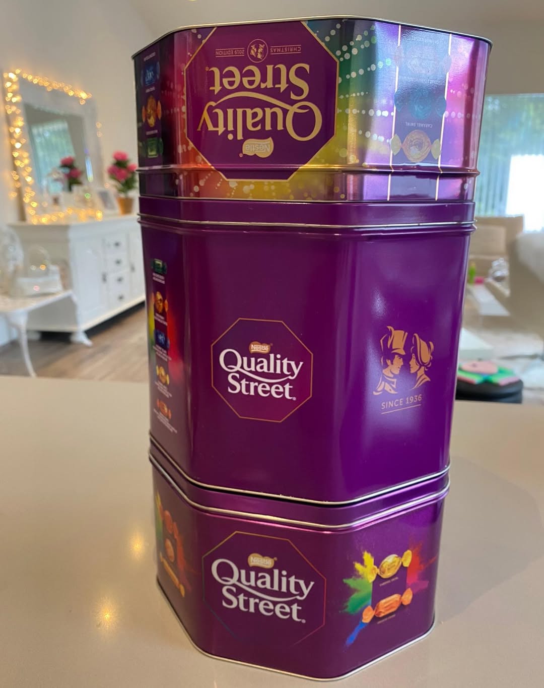 „Ég geymdi Quality Street konfekt kassann minn því ég vissi að ég gæti nýtt hann einhvertíman. Svo fékk ég hugmynd… Ég hringdi í mömmu og spurði hvort hún ætti nokkra tóma Quality Street konfekt kassa í geymslunni, það hélt hún sko….. Ég sótti konfekt kassana og föndraði mér eina fína blómasúlu,“ skrifaði hún á Instagram og birti myndir af útkomunni sem er vægast sagt ótrúleg.