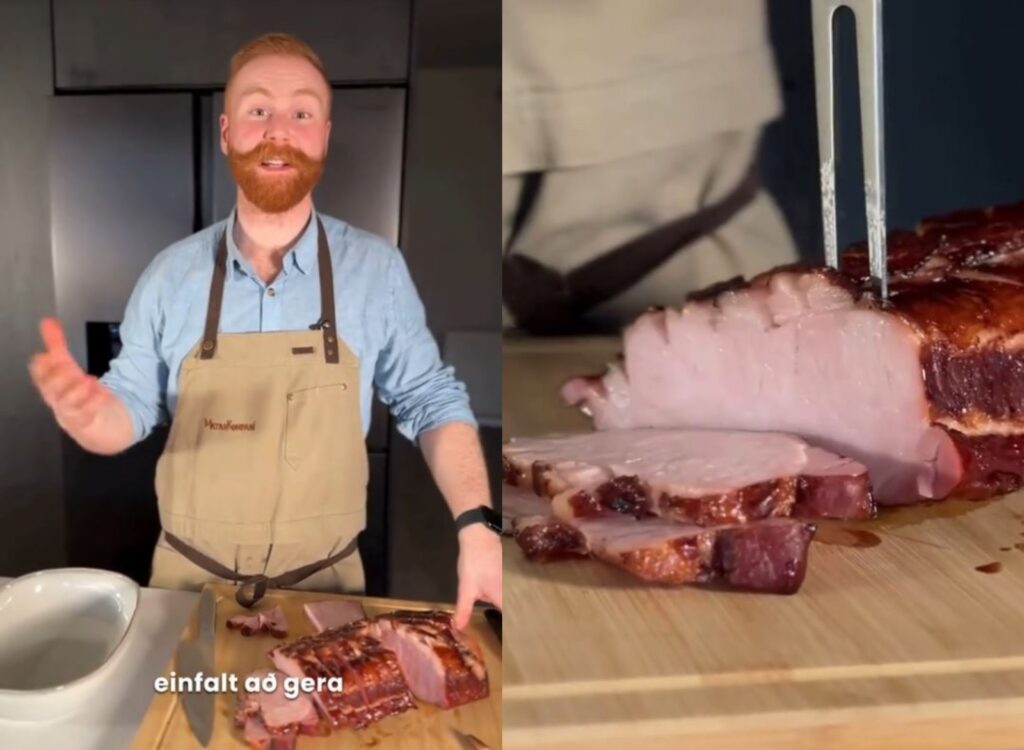 Guðmundur Óli Sigurjónsson, eigandi Matarkompaní, sýnir hvernig hann eldar hamborgarhrygg í myndbandi á TikTok.