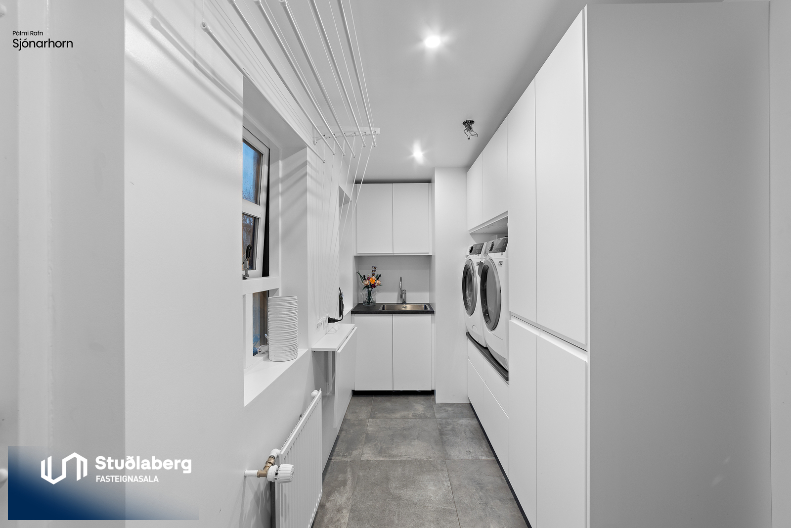 Húsið skiptist í forstofu, tvær stofur þar sem önnur er nýtt sem sjónvarpsstofa í dag, eldhús, hjónaherbergi með sérbaðherbergi, þrjú svefnherbergi, baðherbergi og þvottahús.