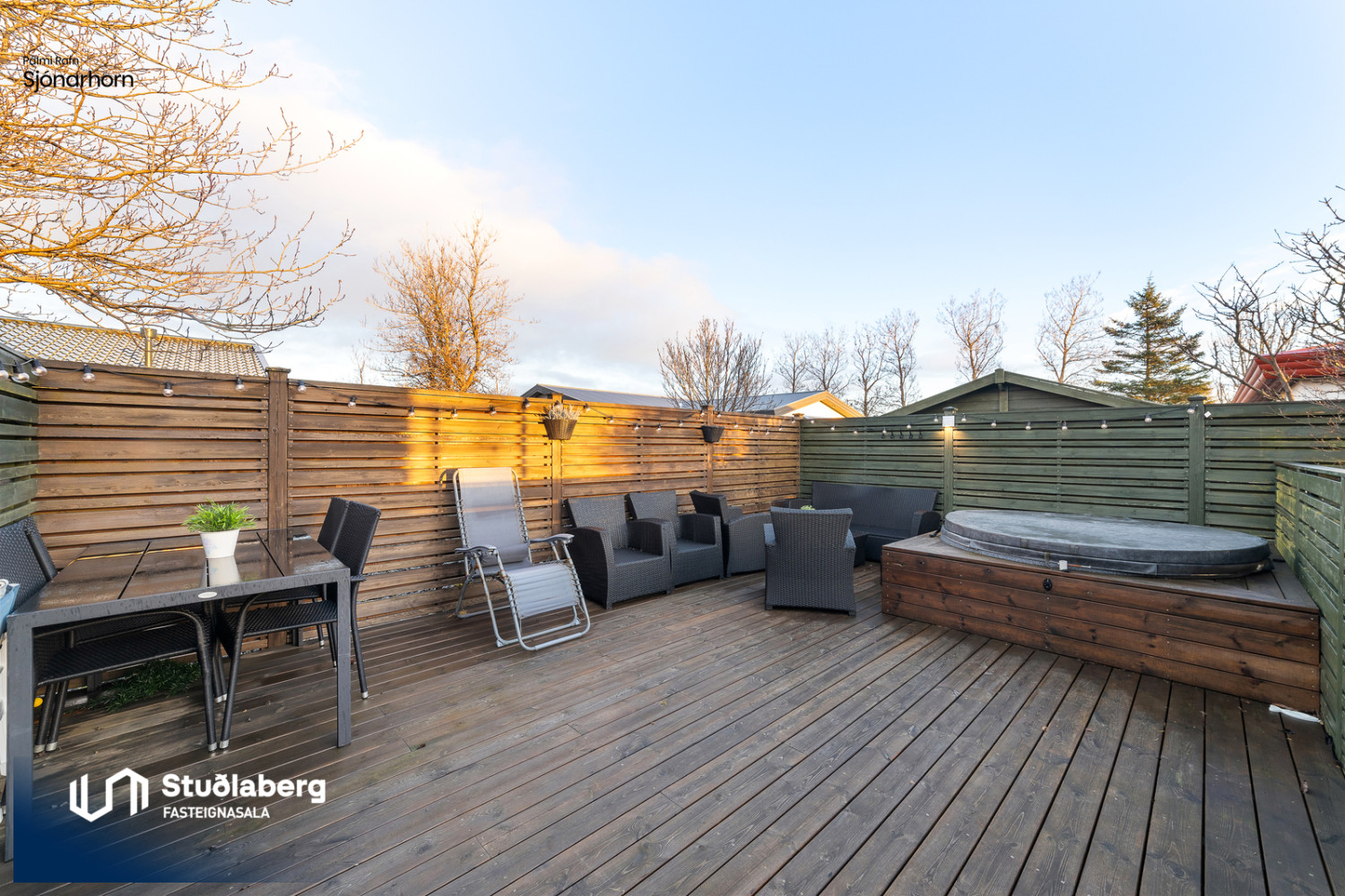 Húsið er múrað í fallegum spænskum stíl og með bekk með geymsluplássi undir við hlið inngangs. Garður er fallegur og  gróinn og með skjólsælum sólpalli með heitum potti. Bílastæði er stórt og hellulagt með snjóbræðslu.