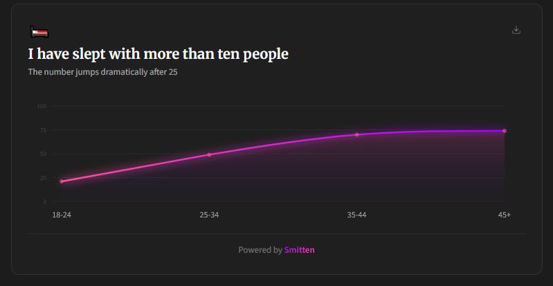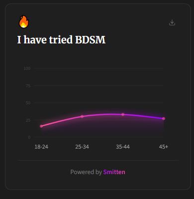 Niðurstöðurnar leiða annað óvænt í ljós. Yfir helmingur svarenda sefur nakinn. Kynlíf á almannafæri er í raun algengara en ekki. Meira en þriðjungur hefur sofið hjá fleiri en tíu manneskjum. BDSM, þrátt fyrir orðspor sitt sem sérhæft kynlíf, skilar inn 25%.