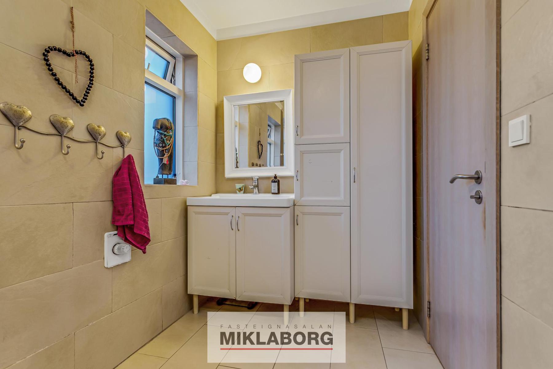Íbúðin er 156,5 fm sérhæð á fyrstu hæð með sérinngangi, ásamt bílskúr, í húsi sem byggt var 1961. Íbúðin skiptist í forstofu, eldhús, stofu/borðstofum þrjú svefnherbergi og baðherbergi. Auðvelt er að bæta við fjórða svefnherbergi inn af stofu.