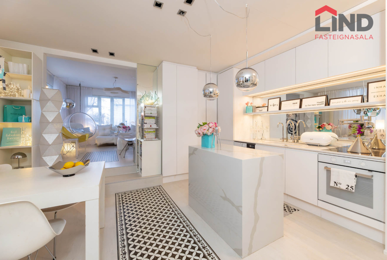 Eldhúsinnréttingin er ný og sérhönnuð, teiknuð og smíðuð hjá fyrirtækinu Axis.Skápaplássið í eldhúsinu er alveg tvöfalt því allt er sérhannað og sérsmíðað þannig að hver sentimetri er nýttur og því er eins og um helmingi stærra eldhús sé að ræða. Blöndunartæki með rennandi vatni er beint fyrir ofan spanplöturnar frá Innréttingar og tæki. Í öðru blöndunartækinu er innbyggt sódavatnsstreymi þar sem hægt er að stilla á einfaldan hátt og fá sódavatn ískalt beint úr krananum. Í stærri krananum er hægt að stilla sjóðandi vatn beint úr krananum og bullsjóðandi beint í bollann. Sérstakar græjur og tæki fylgja með þessum einstöku krönum og eru þau í innréttingunni. Einnig er nýjung yfir spanhellunum þar sem er krani með rennandi vatni sem fer beint í pottinn eða ketilinn á suðuplötunni.