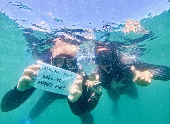 Birti Hetfield mynd á Instagram þar sem sjá mátti parið neðansjávar í köfunarbúningum. Hetfield með lítið skilti sem á stendur: „Adriana Gillet, vilt þú giftast mér?“
