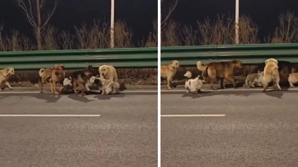 Kínverskur netverji sem kallar sig Lu náði myndbandi af hundunum á leið sinni heim en Lu segir: „Þeir litu út fyrir að vera hópur bræðra í neyð, þeir hreyfðu sig í takt og minntu ekkert á flækingshunda.“