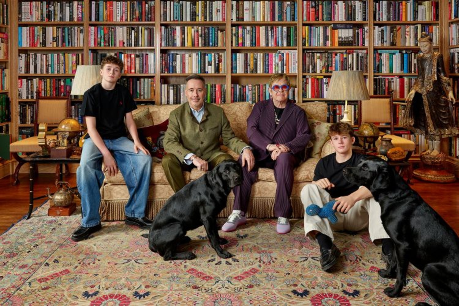 Synir tónlistarmannsins Elton John og David Furnish stilltu sér upp með feðrum sínum stuttu fyrir jól í bókaherbergi heimilisins.