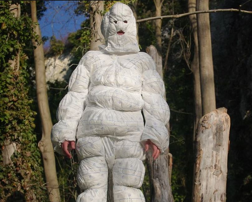 Veran var þó bara Mennell, sem hafði saumað saman 24 pappírsbleyjur í búning sem hann klæddi sig í. Eins og barnafólk veit þá eru bleyjurnar rakadrægar og því blés búningurinn út þegar Mennell dífði sér í fljótið. Var ásjóna hans ansi ófrýnileg.