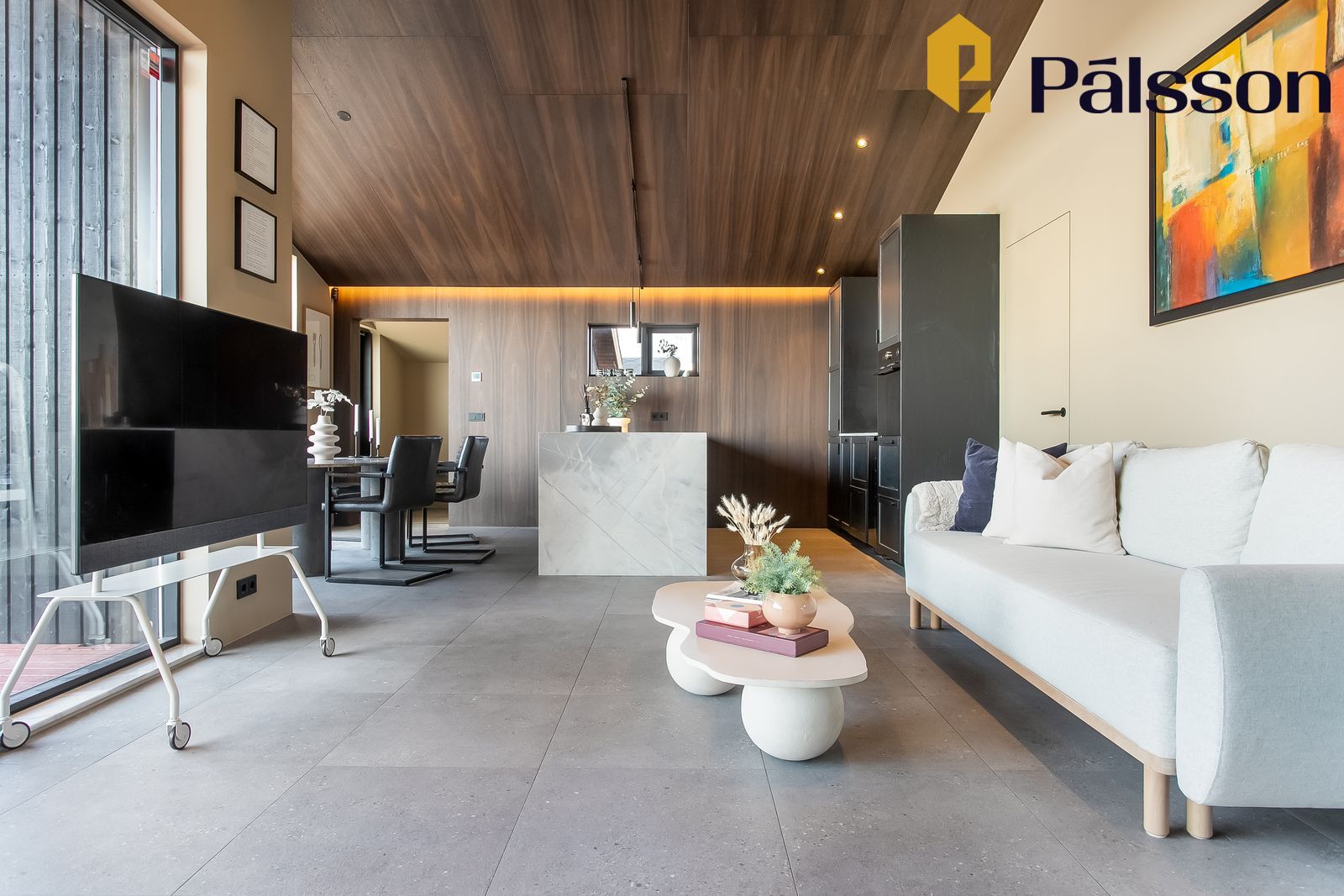 Stofa, borðstofa og eldhús eru í alrými með mikilli lofthæð, fallegri viðaráferð og innfelldri lýsingu.