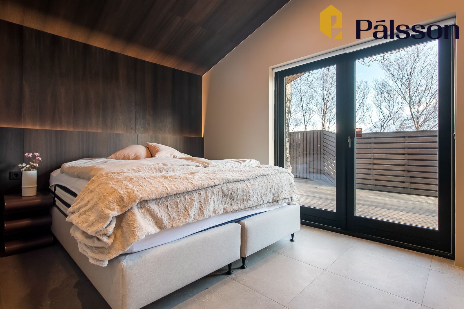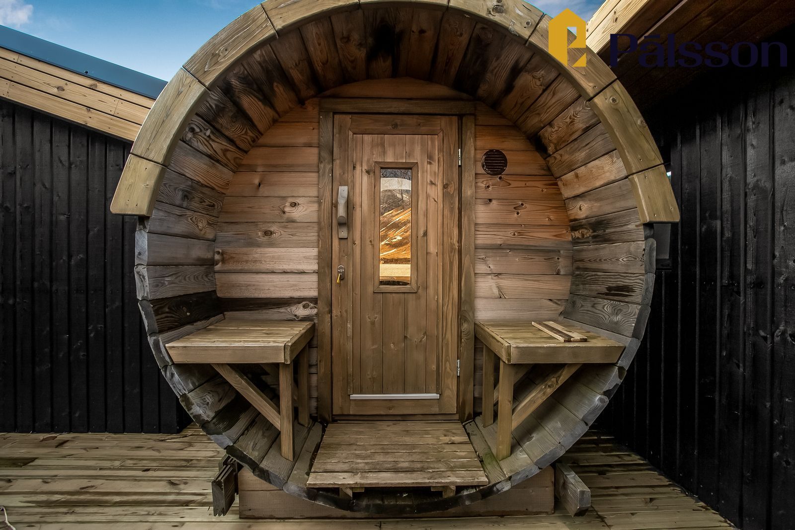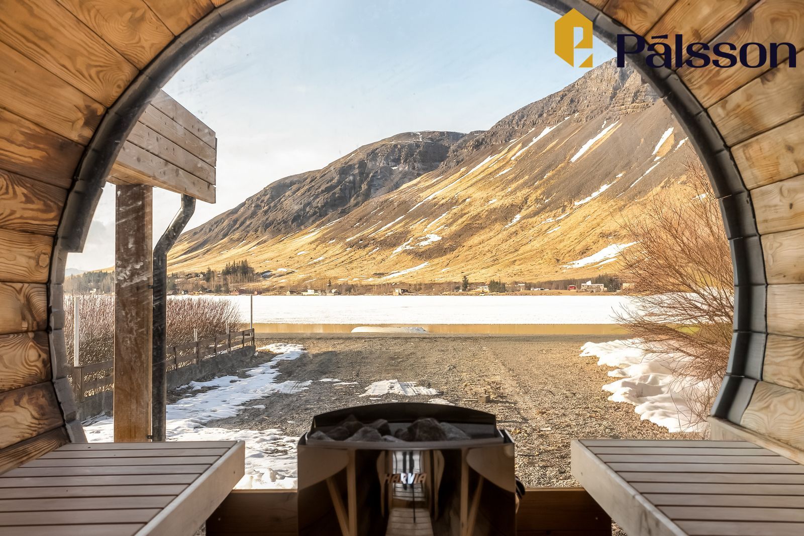Frá alrýminu er útgengt út á rúmgóða verönd þar sem er heitur pottur og aðstaða til útiveru, auk þess sem stærra baðherbergið hefur einnig útgengi út á verönd. Sauna með útsýni yfir vatnið setur sérstakan svip á eignina.
