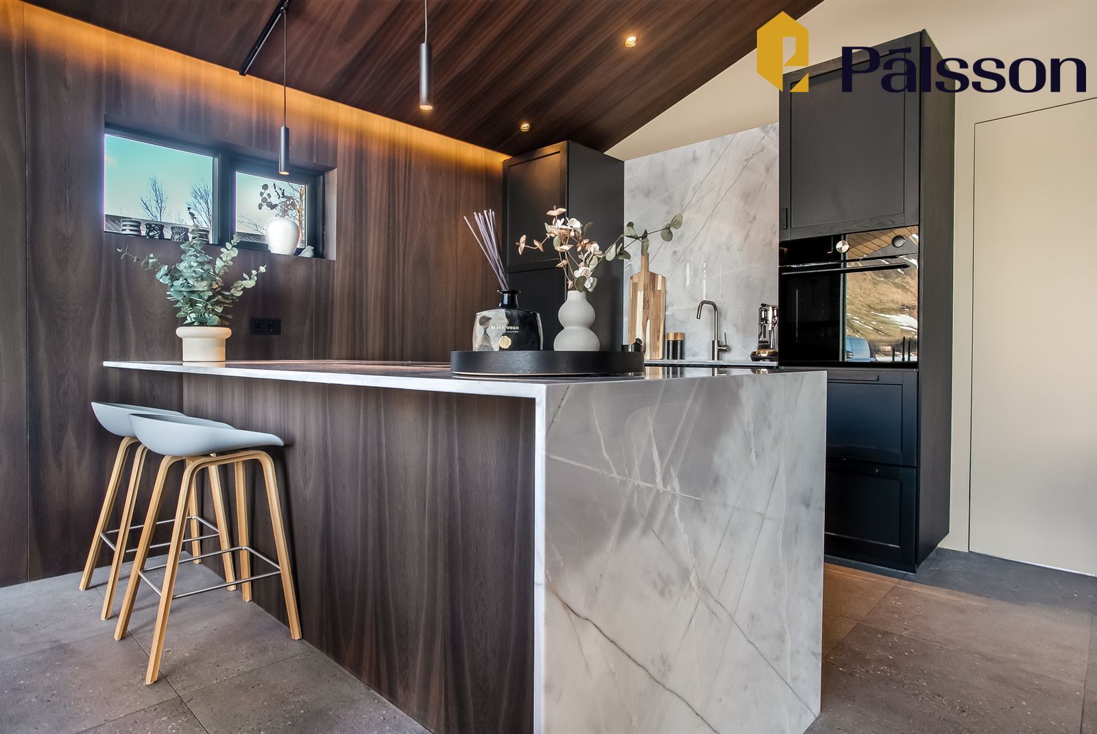 Eldhúsið er með stórri eyju og steináferð sem nýtur sín vel í rýminu, ásamt góðu vinnuplássi.