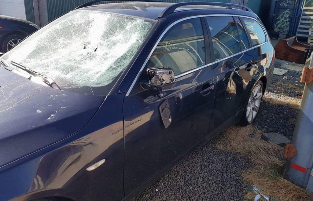 Stórt gat var mölvað á afturrúðu bílsins og framrúða hans einnig lamin í spað, mögulega með kylfu. Þá voru flestar hliðar bílsins barðar og á einni farþegahurðinni má sjá djúpa dæld. Hliðarspeglar bílsins eru illa leiknir; þeir sjást dingla niður á meðfylgjandi myndum. Þá var vélarhlífin öll skröpuð upp og sködduð og lakk víðsvegar á bílnum illa skemmt.