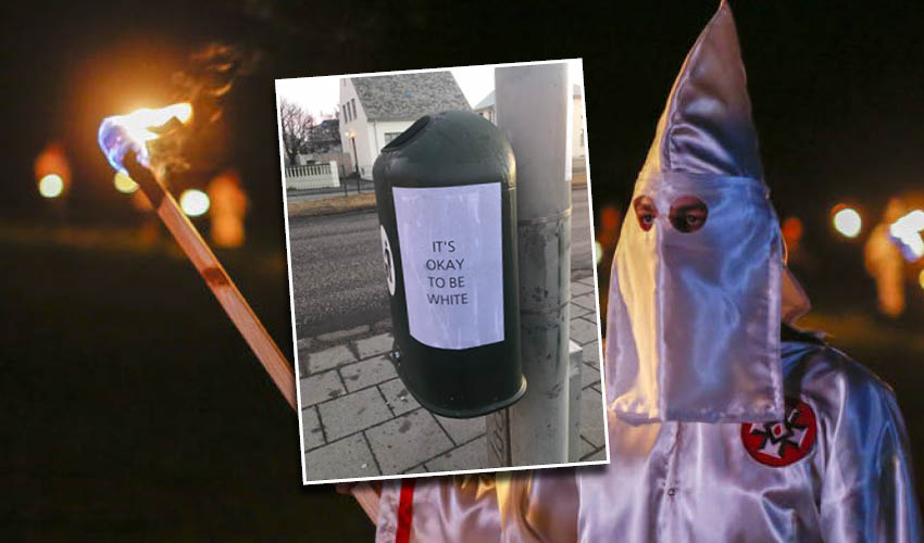 Einhver hefur hengt veggspjald sem á stendur „It‘s OK to be white“, eða „Það er í lagi að vera hvítur“ í ruslafötu í Vesturbæ Reykjavíkur. Hekla E. Aðalsteinsdóttir vekur athygli á þessu á Twitter og spyr: „Getur einhver útskýrt þennan gjörning fyrir mér?“