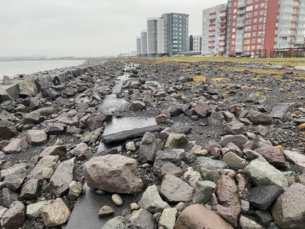 Á ljósmyndum sem ljósmyndari DV tók af svæðinu má sjá miklar skemmdir á malbikinu. Stórt grjót hefur flogið upp á stíginn og brotið og bramlað á leið sinni. „Þarna eru steinar sem eru mörg hundruð kíló að þyngd sem hafa flogið tugi metra upp úr sjónum,“ segir viðmælandi DV sem var á staðnum.