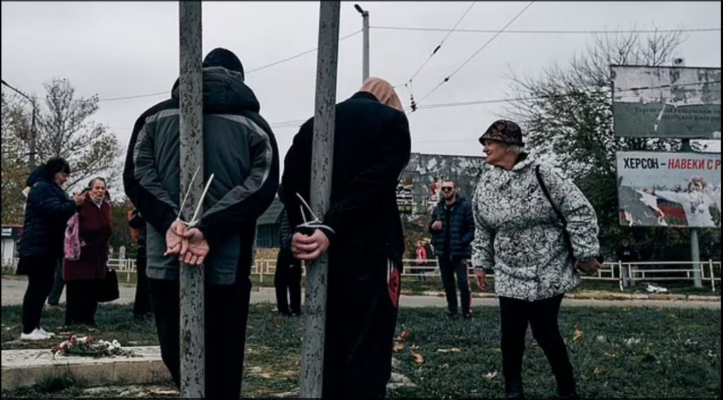 Flestir þeirra Úkraínumanna sem aðstoðuðu innrásarliðið hafa flúið borgina á síðustu vikum. Það gerðu þó ekki allir og meðal annars voru tveir meintir landráðamenn handteknir og bundir við ljósastaura á götu í Kherson og gerði heimafólk aðsúg að þeim. Hermenn gæta þeirra þó og má búast við að réttað verði yfir mönnunum þegar um hægist.