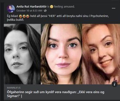 „Ljóst er að stefnandi gagnrýndi með þessum ummælum sínum að suð um kynlíf væri lagt að jöfnu við alvarlegt kynferðisbrot eins og nauðgun. Þótt gagnrýni stefnanda væri að þessu leyti efnislega málefnaleg gekk stefnandi hins vegar mun lengra með því að uppnefna forvígisfólk umræðunnar „psychoherinn“ og lýsa með því efasemdum um andlegt heilbrigði þess, ásamt því að birta mynd af þremur konum í færslu sinni. Það hvernig stefnandi setti fram gagnrýni sína að þessu leyti var því ekki í samræmi við starfsskyldur hennar“