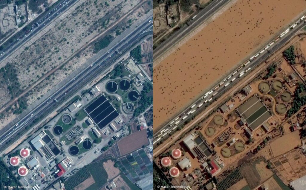 Flóðin miklu í Valencia og nærliggjandi svæðum á austurströnd Spánar hafa ekki aðeins valdið gríðarlegu manntjóni. Nýjar gervihnattarmyndir sýna glöggt þá gríðarlegu eyðileggingu sem flóðin hafa valdið á mannvirkjum og umhverfinu.