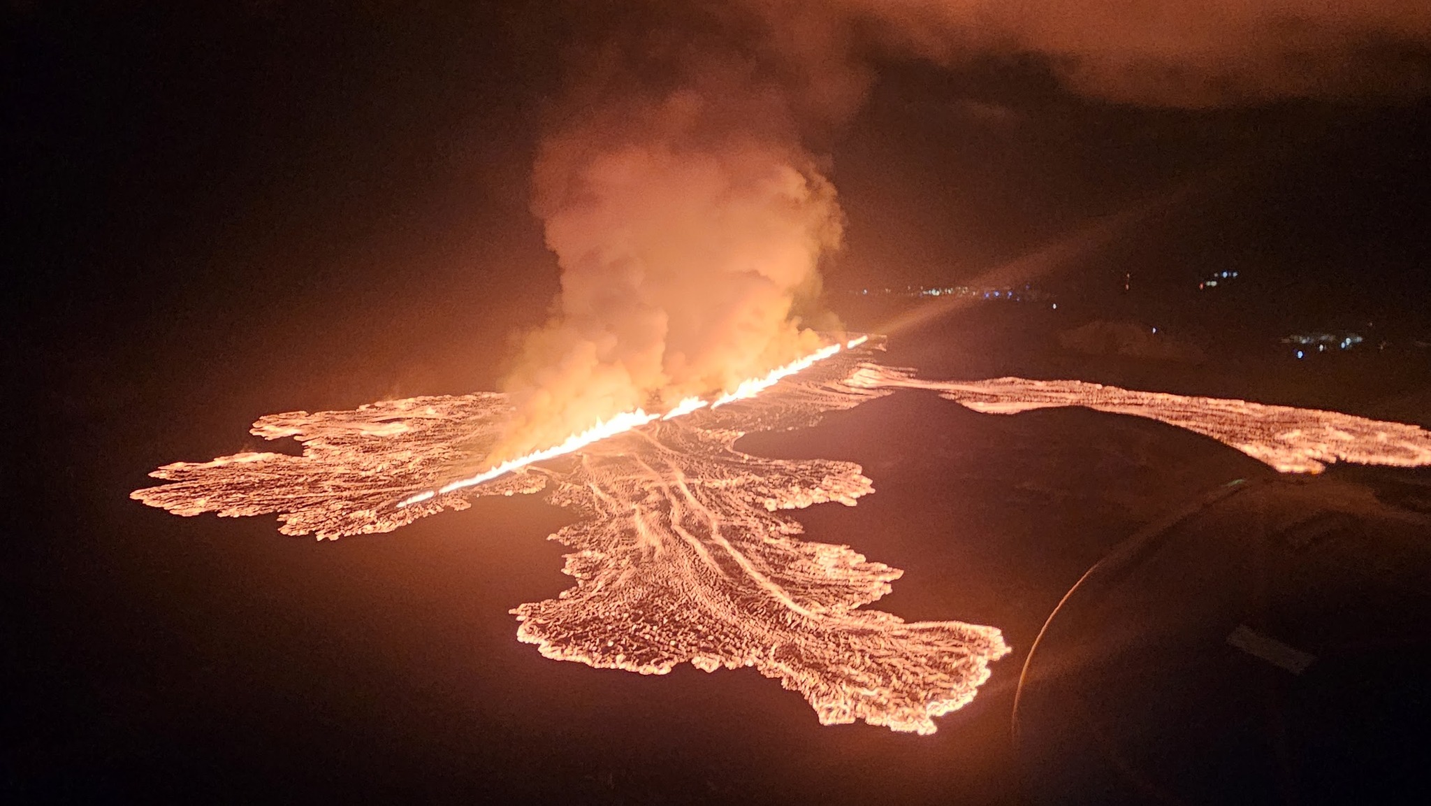 „Vestari hrauntungan, sú sem rennur milli Sýlingarfells og Stóra Skógfells, rann yfir Grindavíkurveg rúmlega kl. 04:30 og nálgast Njarðvíkuræð. Áætlað hraunrennsli á þessari hrauntungu er um 300 metrar á klukkustund. Nyrðri hrauntungan rennur ekki í átt að neinum innviðum.“