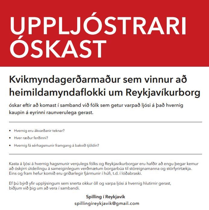 Þeir sem búa yfir slíkum upplýsingum eru beðnir um að vera í sambandi í gegnum netfangið spillingireykjavik@gmail.com