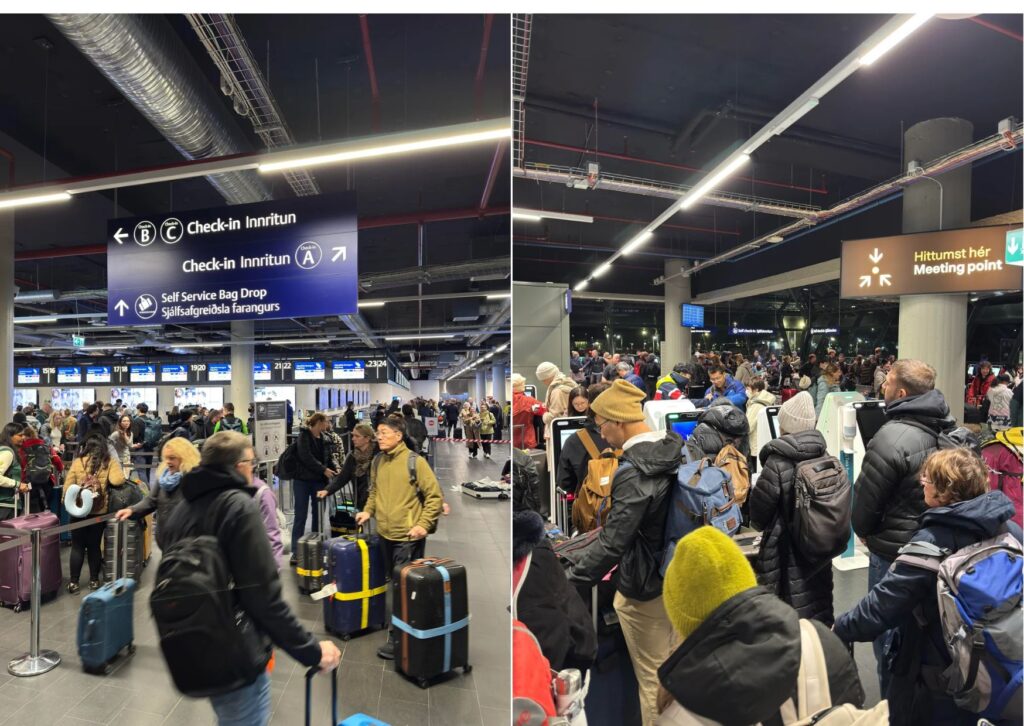 Ferðamaðurinn segir að þegar hópurinn kom til landsins fyrir tíu dögum hafi ekki virst sem svona mikill fjöldi væri á vellinum, „vo við gerum ráð fyrir að það sé vegna nýlegs vandamáls með Play? Við fengum tölvupóst frá Icelandair þar sem boðið var upp á ferðagjafabréf til að skipta um flug.