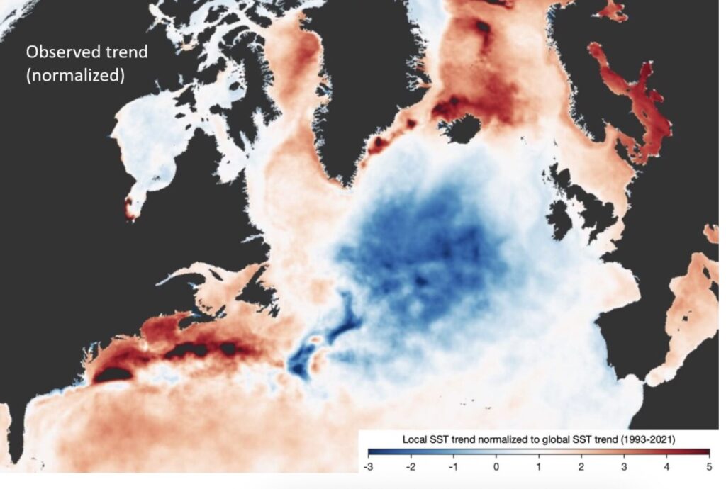 Nýjar rannsóknir vísindamanna í Utrech sýni hins vegar að vendipunkturinn sé skammt undan og birtir hann skýringarmyndir. Það er að stór svæði Atlantshafsins kólni um 4 til 6 gráður sem og belti undan austurströnd Norður Ameríku hlýni um það sama þegar golfstraumurinn færist norðar. Seinni myndin sýni breytingar á yfirborðshita sjávar frá 1993 til 2021. Myndirnar sýni svipaða þróun.