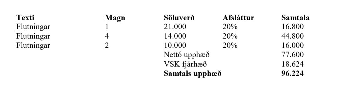 Daginn eftir að reikningurinn barst hafi hún talað við flutningamanninn. Hann hafi þá orðið „vandræðalegur“ og sagt henni að hann hefði ekki fengið samþykki frá sambúðarkonu sinni, sem væri bókari fyrirtækisins. Þá hafi hann lofað að reikningurinn yrði lagfærður og að hún fengi 60 prósent afslátt. Sem sagt myndi greiða honum 40 þúsund krónur.