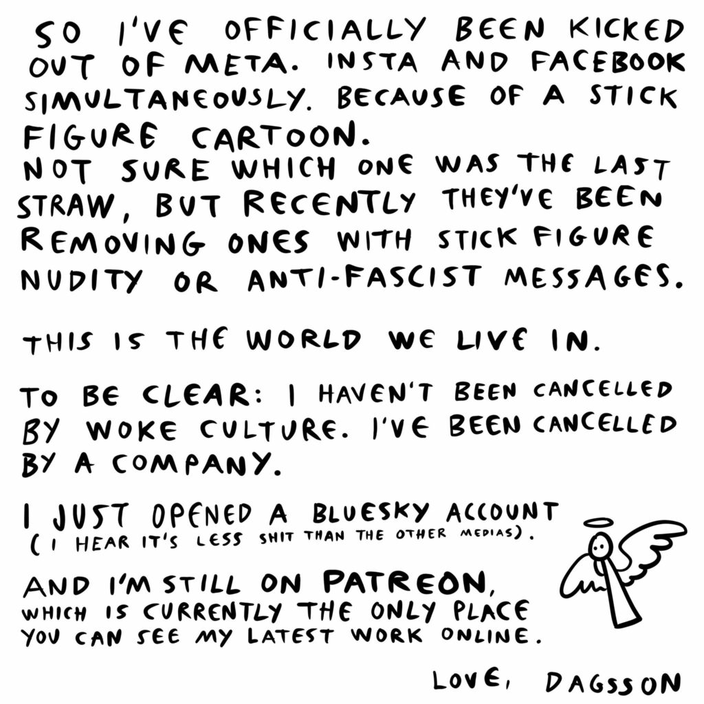 „Ég er ekki viss um hvað var síðasta stráið. En nýlega hafa þeir verið að fjarlægja skopmyndir mínar með nekt prika fólks og andfasískum skilaboðum,“ segir Hugleikur. „Þetta er heimurinn sem við búum í.“