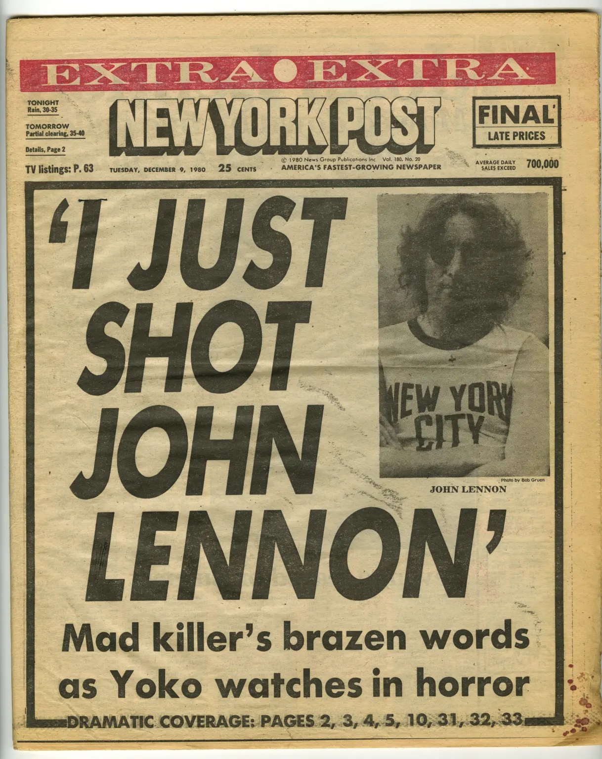 Þann 8. desember 1980 skaut Mark David Chapman Bítilinn ástsæla, John Lennon, til baka fyrir utan heimili hans, Dakota-bygginguna á Manhattan í New York. Lennon var fertugur að aldri. Chapman hlaut 20 ára til lífstíðarfangelsi fyrir morðið.