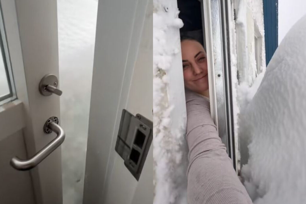 Svo mikill snjór var á heimili hennar að hún gat ekki opnað útidyrahurð. Í myndbandinu sést hún setja hendina út fyrir og taka mynd af sér fastri í húsinu.