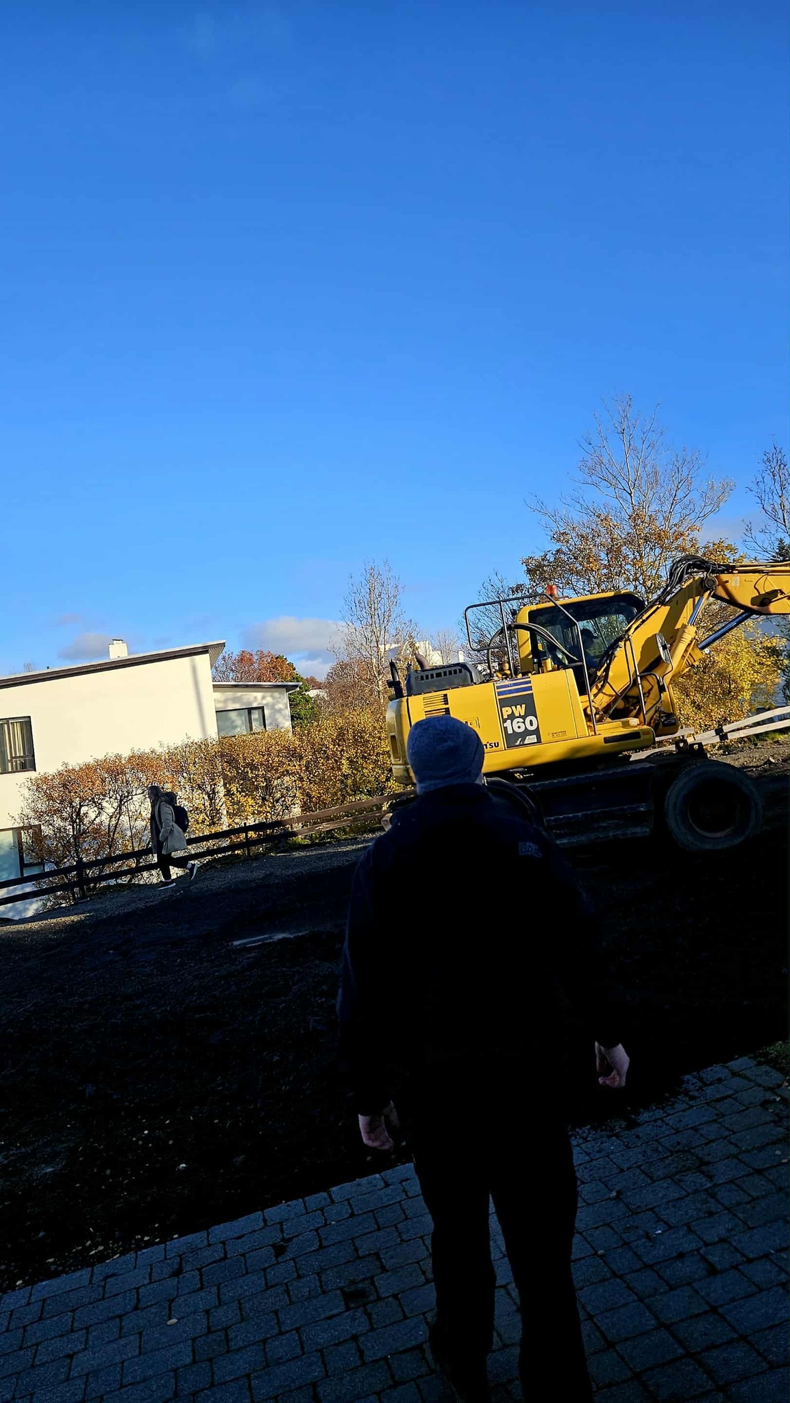Eigum við að ganga fyrir ofan eða neðan gröfuna? segir Sigríður við mynd.