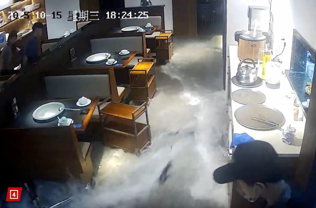 Myndband náðist af atvikinu sem átti sér stað á sjávarréttastað í borginni Fuzhou á austurströnd Kína miðvikudaginn 15. október síðastliðinn.