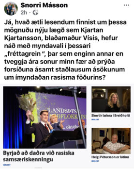„Já, hvað ætli lesendum finnist um þessa mögnuðu nýju lægð sem Kjartan Kjartansson, blaðamaður Vísis, hefur náð með myndavali í þessari „fréttagrein“, þar sem enginn annar en tveggja ára sonur minn fær að prýða forsíðuna ásamt staðlausum ásökunum um ímyndaðan rasisma föðurins?,“ skrifar Snorri. Óhætt er að segja að hann uppskeri mikil viðbrögð við færslunni frá stuðningsmönnum sínum, sem flestir eiga það sameiginlega að hafa ekki mikla trú á íslenskum fjölmiðlum.